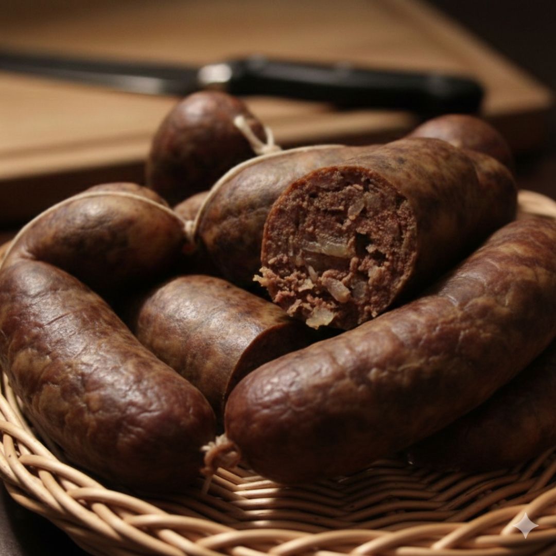 Ingredientes Nobles y Aliño Maestro: Seleccionamos tocino de cerdo de alta calidad y sangre fresca, integrándolos con un aderezo de sal, pimienta y orégano, que aporta ese aroma rústico y casero tan valorado en la gastronomía mediterránea. El uso de tripa natural asegura que, al cocinarla, la piel sea fina y el interior mantenga toda su jugosidad.